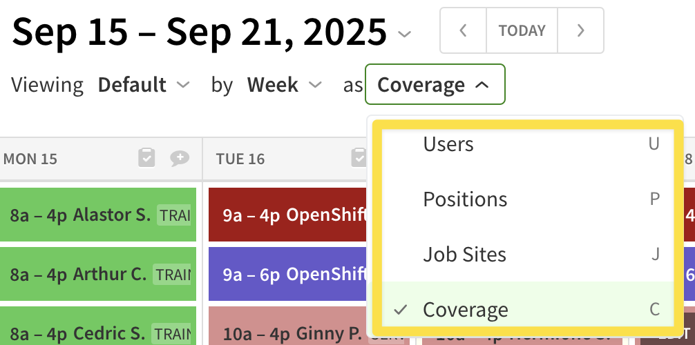 NOTE: Scheduler views have keyboard shortcuts. To navigate to coverage view using the keyboard, select “c”.