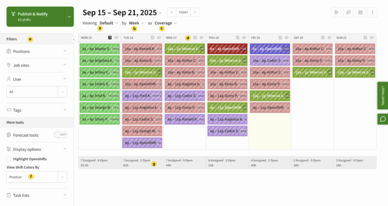 Coverage view displays shifts in chronological order based on start time. Coverage view is a great tool to use when you want to make sure you have an entire week’s worth of shifts covered. It also helps you to determine any gaps for priority shift times.