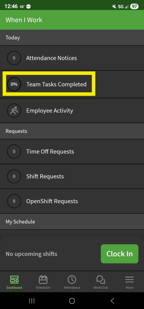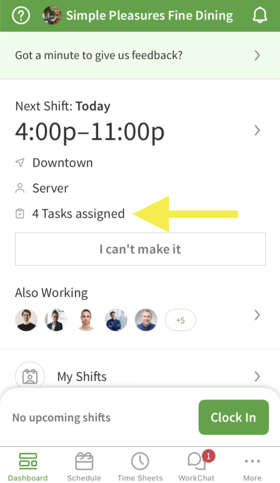 - On the dashboard of the app, in the Next Shift card, tasks will display.