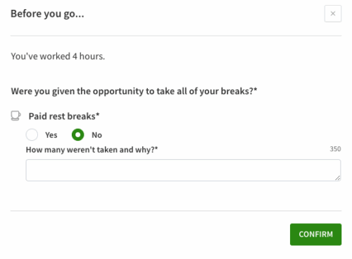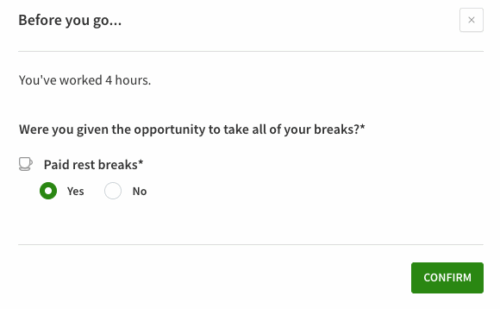 - If No, select No, fill in the required How many weren’t taken and why? field and then click Confirm. You are clocked out for your shift and any missed breaks are recorded on your timesheet.