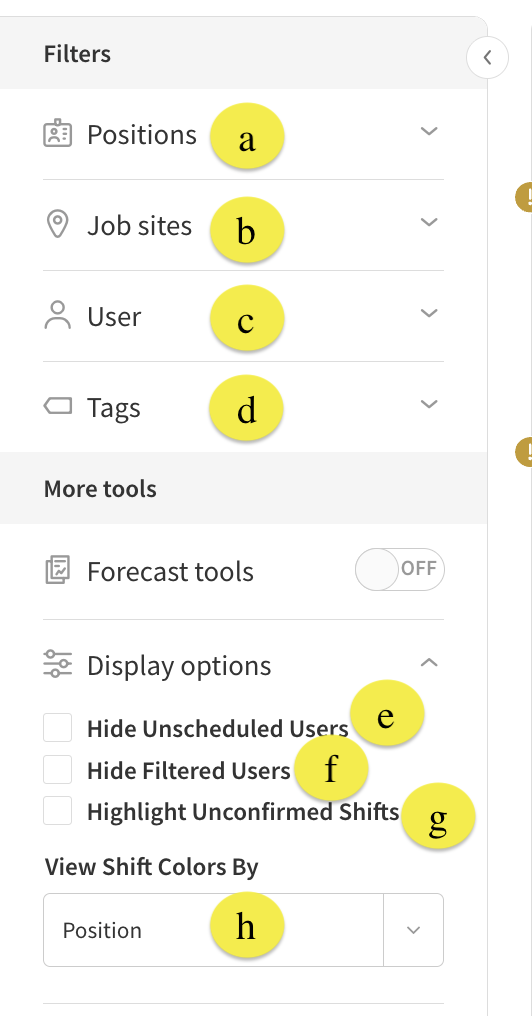| h. View Shift Colors By | Use this dropdown to decide how the colors on your schedule will display. You can set this to Shift, Position, or Job Site. |