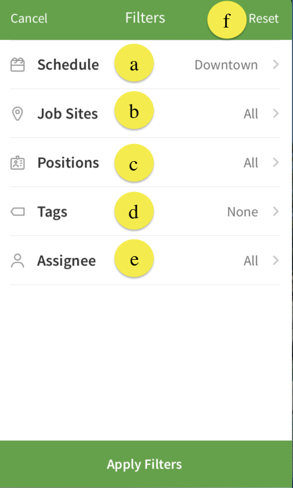 | e. Assignee | Tap Assignee to filter the shifts to a specific user or users’ shifts |