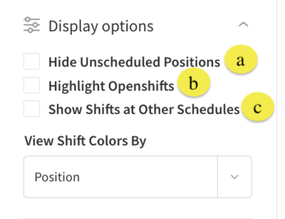 | a. Hide Unscheduled Positions | Checking this box will hide any position from view that does not have a shift scheduled for it. |