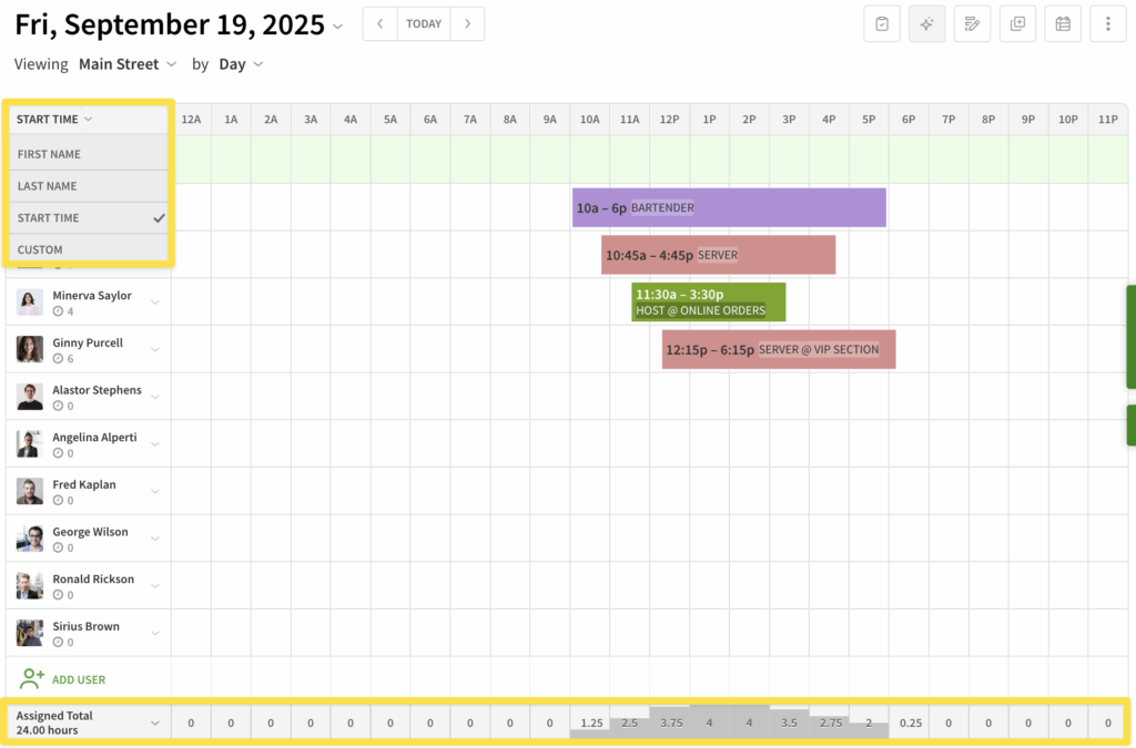 View a user’s assigned and max hours for the week beneath their name when the schedule is in user view using the day or week time views. Assigned hours are totaled across schedules.