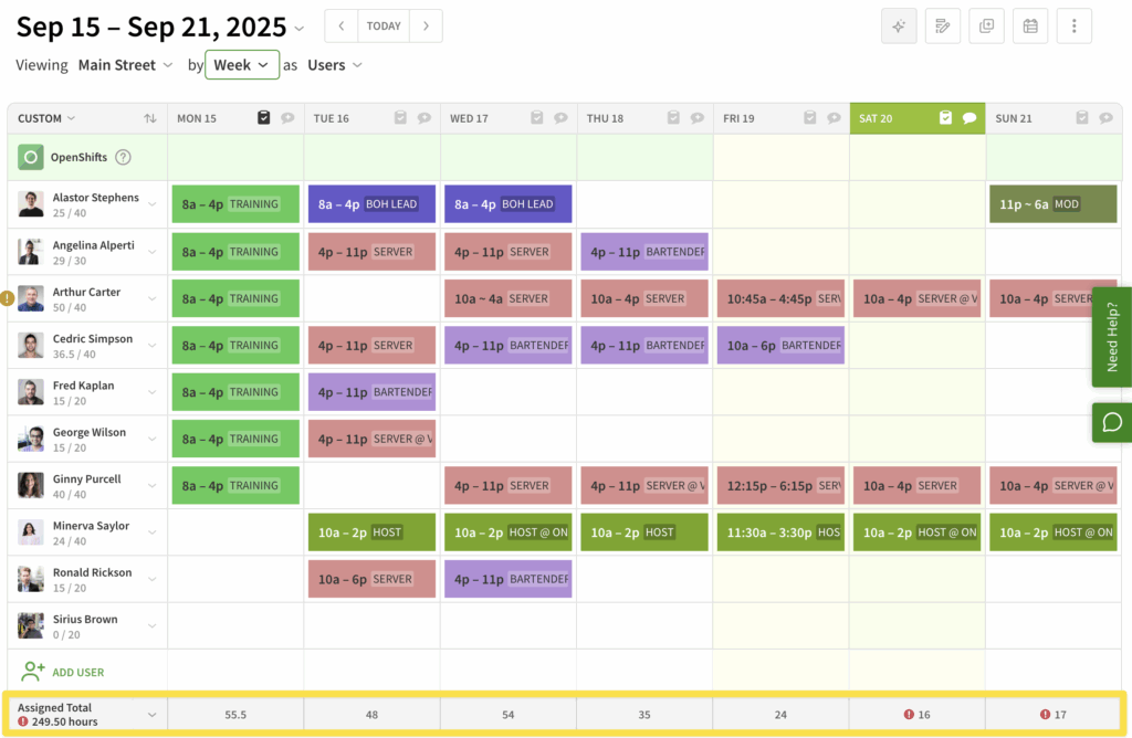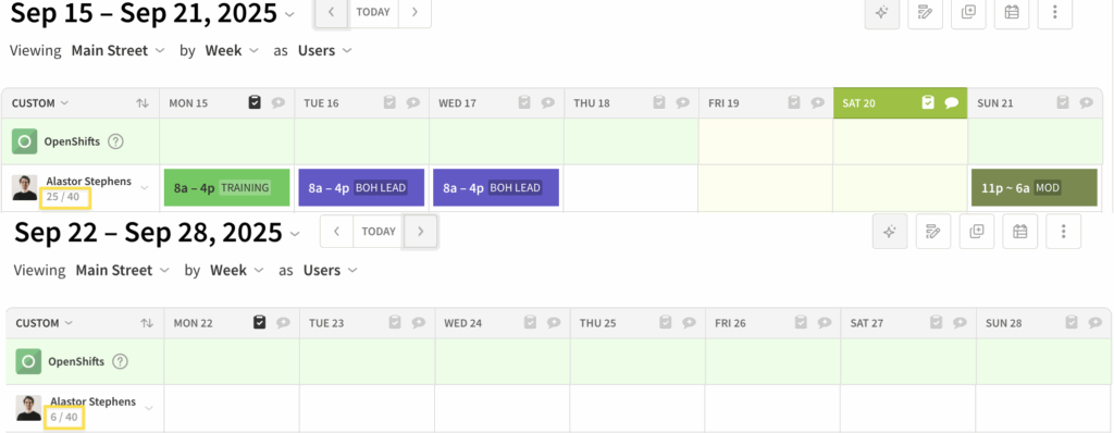View a user’s assigned and max hours for the week beneath their name when the schedule is in user view using the day or week time views. Assigned hours are totaled across schedules.