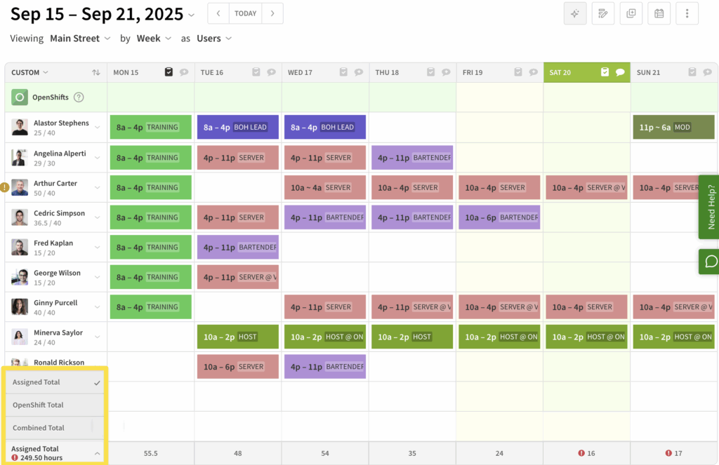 Total hours are displayed in the bottom row of the schedule in day and week view. You can view the total hours for assigned shifts, OpenShifts, or a combined total.
