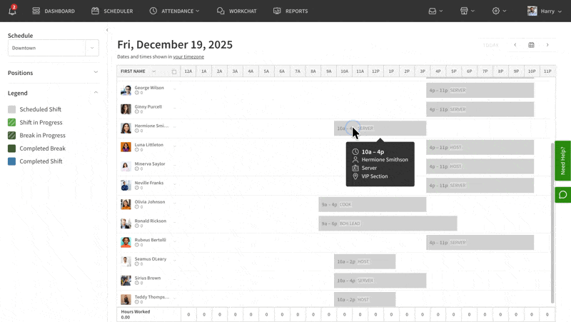 The Time Tracker shows shifts that are coming up and scheduled in light gray, similar to the day view within the Scheduler. However, the Time Tracker also shows actual clocked in hours, so you can see visually if someone is on break, clocking in too early or leaving late.![]()