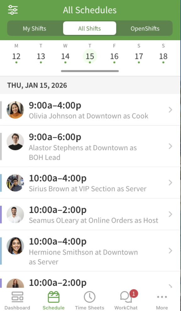 - Your employer can also set up the full team schedule so that you and your coworkers can only see shifts that match your positions.