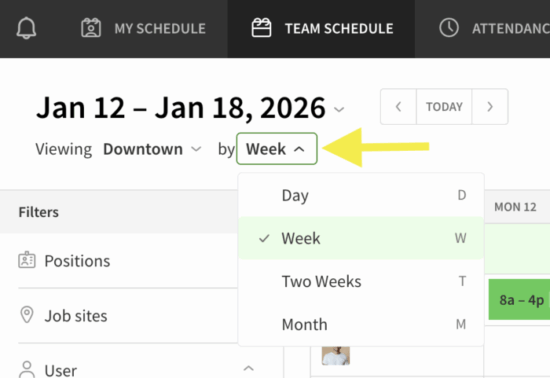 By default, the full team schedule displays one week at a time. To view a different length of time, click Day, Week, 2 Week, or Month in the by section under the dates of the schedule.