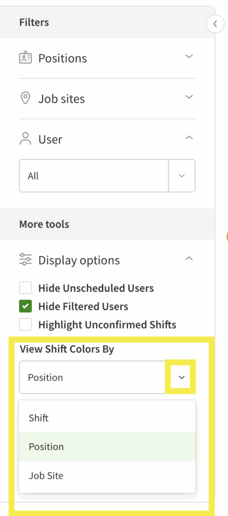 In the left-side filter menu, click the View Shift Colors By dropdown and select which color scheme you want to view. Keep in mind, colors are set by your employer and can only be changed by them. Also, colors may overlap and be the same across different views if your employer has set it up that way.