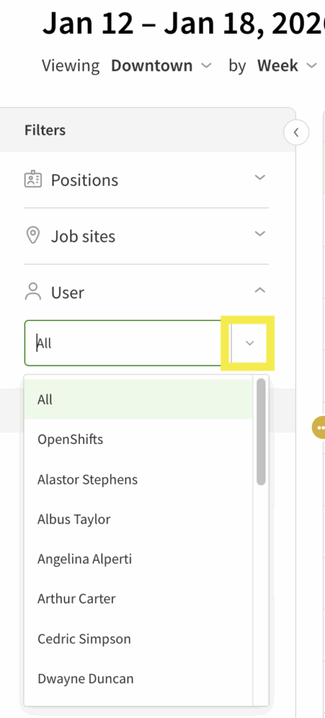 - To filter shifts by schedule, job site, position, or user, tap in the top-left corner of the screen.